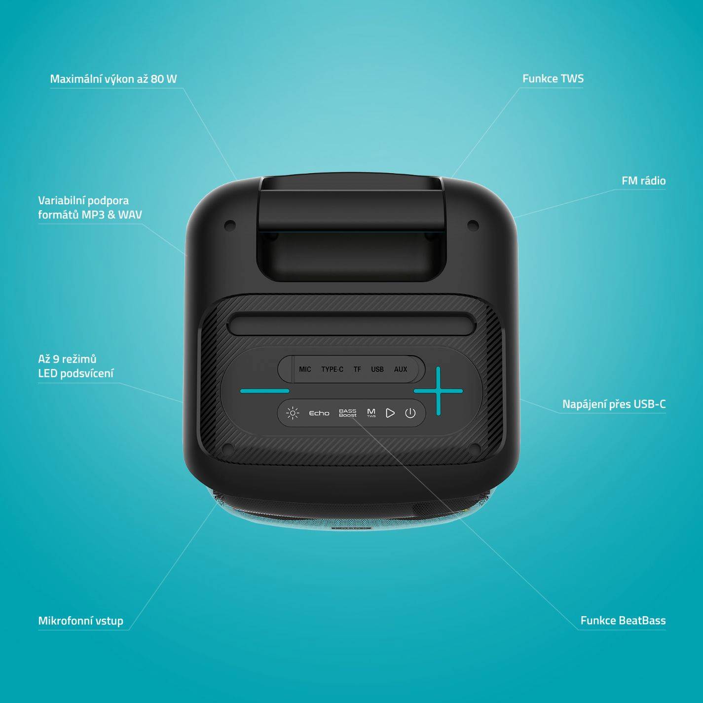 Způsob použití:Na párty; Outdoor použití; Výkon reproduktoru (W):80; Barva reproduktoru:Černá; LED světla; Typ připojení:Bluetooth, Jack 3,5 mm; Bluetooth verze:5.3; Slot MicroSD; Typ baterie:Li-Ion; Kapacita baterie (mAh):6000; Výdrž baterie (h):13; Hmotnost (g):4500; Způsob nabíjení:USB-C