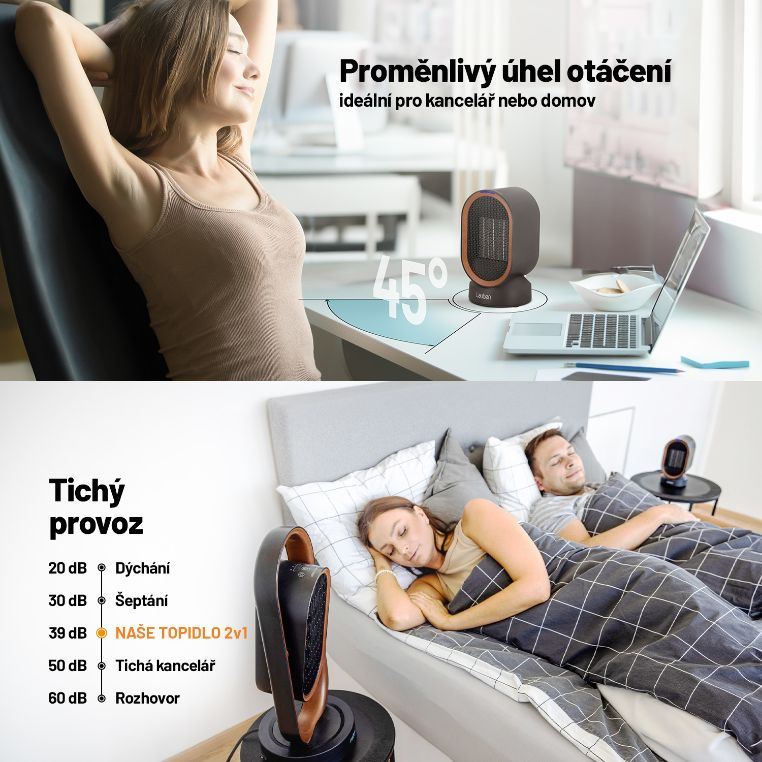 Zakúri vám, ale vie byť aj chladnýDopriať si príjemné teplúčko, kedykoľvek pociťujete prílišné dotieranie pani zimy, je teraz jednoduchšie, než by sa mohlo zdať. Nemusíte hneď zapínať kúrenie, stačí povolať do akcie Lauben Desk Fan&Heater 2in1 600BB. Tento malý, ale šikovný krásavec s výkonom 600 W ukrýva PTC keramický ohrievač zaisťujúci energeticky efektívny výkon. Zároveň je jeho prevádzka bezpečná a to aj vďaka poistke proti prehriatiu a prevrhnutiu. Bezlopatkové prevedenie neohrozuje deti ani domácich miláčikov. Bez problémov vykúri až 10 m2 a vie sa točiť v uhle 45°. S rovnakou vervou sa však púšťa aj do chladenia. Prepnutím na mód vetráka prirodzene prúdením vzduchu ochladíte miestnosť. Avšak riešenie 2v1 vyrobené v high end Lauben dizajne vás chladnými nenechá.