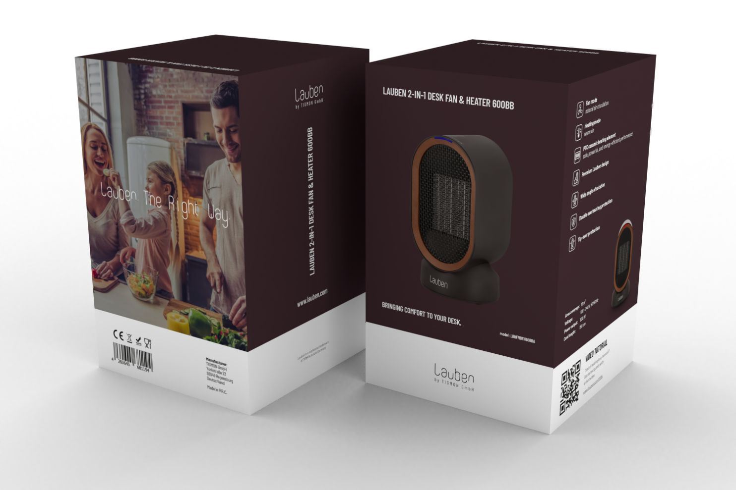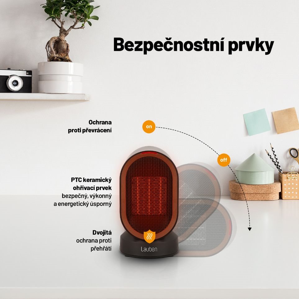 Ohrievač a vetrák v jednom v high end Lauben dizajne ukrýva výkon 600 W, ktorý pokryje až 10 m2. Možnosť točenia v uhle 45° poskytuje užívateľský komfort, prístroj si nastavíte tak, aby vám to bolo príjemné. Bezpečná prevádzka je zaistená poistkou proti prehriatiu a poistkou proti prevrhnutiu.