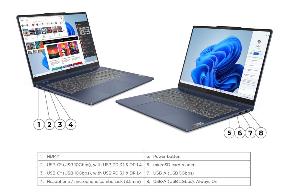 | Standartné porty | 1x USB-A (USB 5Gbps / USB 3.2 Gen 1) 1x USB-A (USB 5Gbps / USB 3.2 Gen 1), Always On 2x USB-C® (USB 10Gbps / USB 3.2 Gen 2), with USB PD 3.1 and DisplayPort™ 1.4 1x HDMI® 1.4b 1x Headphone / microphone combo jack (3.5mm) 1x microSD card reader |