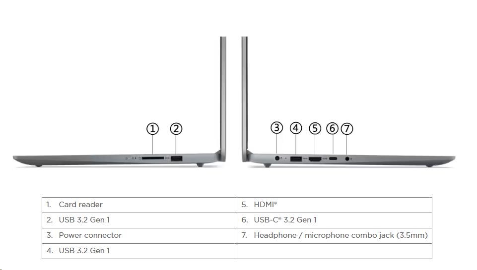 | Standartné porty | 2x USB 3.2 Gen 1 1x USB-C® 3.2 Gen 1 (support data transfer, Power Delivery and DisplayPort™ 1.2) 1x HDMI® 1.4 1x Headphone / microphone combo jack (3.5mm) 1x Card reader 1x Power connector |