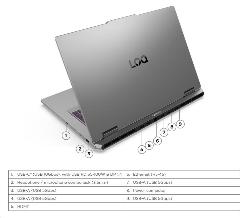 | Standartné porty | 2x USB-A (USB 5Gbps / USB 3.2 Gen 1) 1x USB-C® (USB 5Gbps / USB 3.2 Gen 1), data transfer only 1x HDMI® 2.1, up to 8K/60Hz 1x Headphone / microphone combo jack (3.5mm) 1x Ethernet (RJ-45) 1x Card reader 1x Power connector |