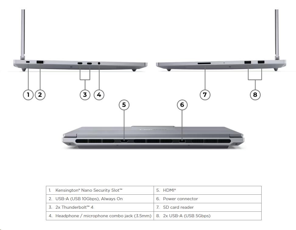 | Standartné porty | 2x USB-A (USB 5Gbps / USB 3.2 Gen 1) 1x USB-A (USB 10Gbps / USB 3.2 Gen 2), Always On 2x USB-C® (Thunderbolt™ 4 / USB4® 40Gbps), with USB PD 3.0 and DisplayPort™ 2.1 1x HDMI® 2.1, up to 8K/60Hz 1x Headphone / microphone combo jack (3.5mm) 1x SD card reader 1x Magic Bay (pogo pin connector) 1x Power connector |