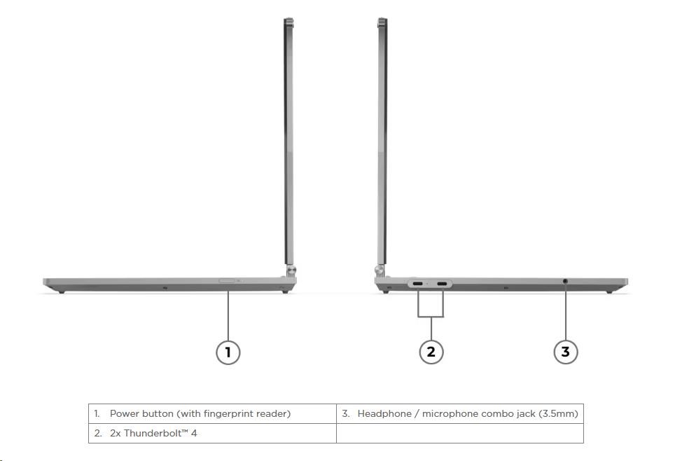 | Standartné porty | 2x USB-C® (Thunderbolt™ 4 / USB4® 40Gbps), with USB PD 3.1 and DisplayPort™ 2.1 1x Headphone / microphone combo jack (3.5mm) |