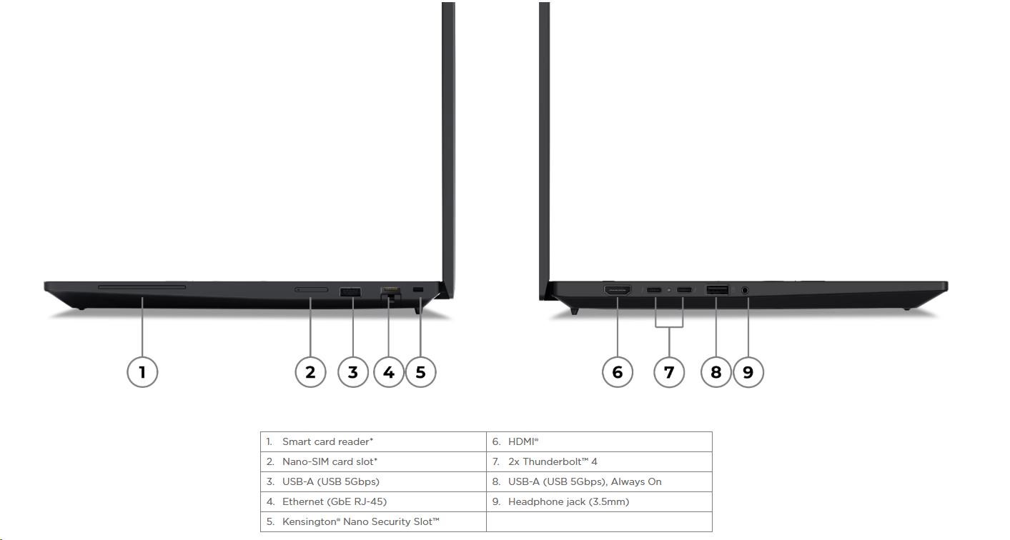 | Standartné porty | 1x USB-A (USB 5Gbps / USB 3.2 Gen 1) 1x USB-A (USB 5Gbps / USB 3.2 Gen 1), Always On 2x Thunderbolt™ 4, with USB PD 3.0 1x HDMI® 2.1, up to 4K/60Hz 1x Headphone / microphone combo jack (3.5mm) 1x Ethernet (GbE RJ-45) 1x Security keyhole 1x Smart Card Reader |