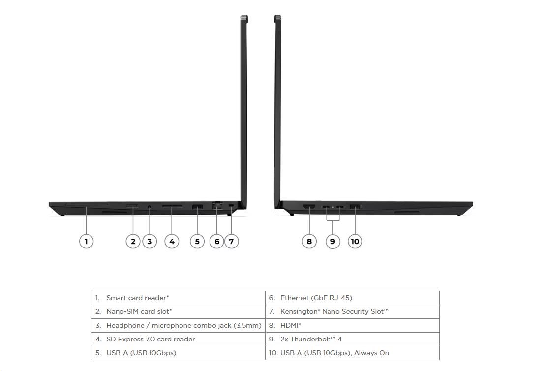 | Standartné porty | 1x USB-A (USB 10Gbps / USB 3.2 Gen 2), Always On 1x USB-A (USB 10Gbps / USB 3.2 Gen 2) 2x Thunderbolt™ 4, with USB PD 3.1, 140W input / 15W output 1x HDMI® 2.1, up to 8K/60Hz 1x Headphone / microphone combo jack (3.5mm) 1x Ethernet (GbE RJ-45) 1x SD Express 7.0 card reader 1x Security keyhole |