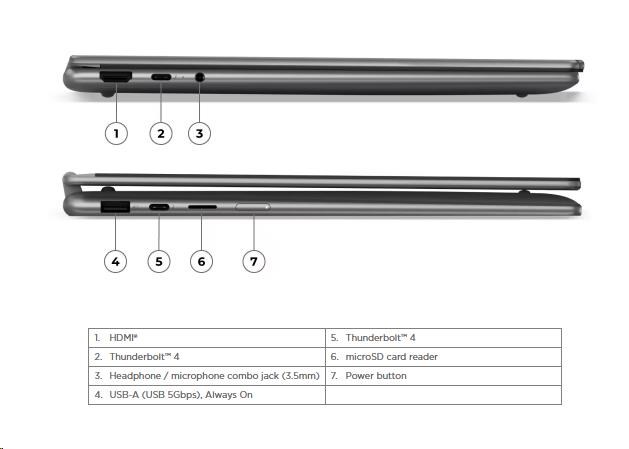 Standartné porty | 1x USB-A (USB 5Gbps / USB 3.2 Gen 1), Always On 2x USB-C® (Thunderbolt™ 4 / USB4® 40Gbps), with USB PD 3.0 and DisplayPort™ 2.1 1x HDMI® 1.4b 1x Headphone / microphone combo jack (3.5mm) 1x microSD card reader |