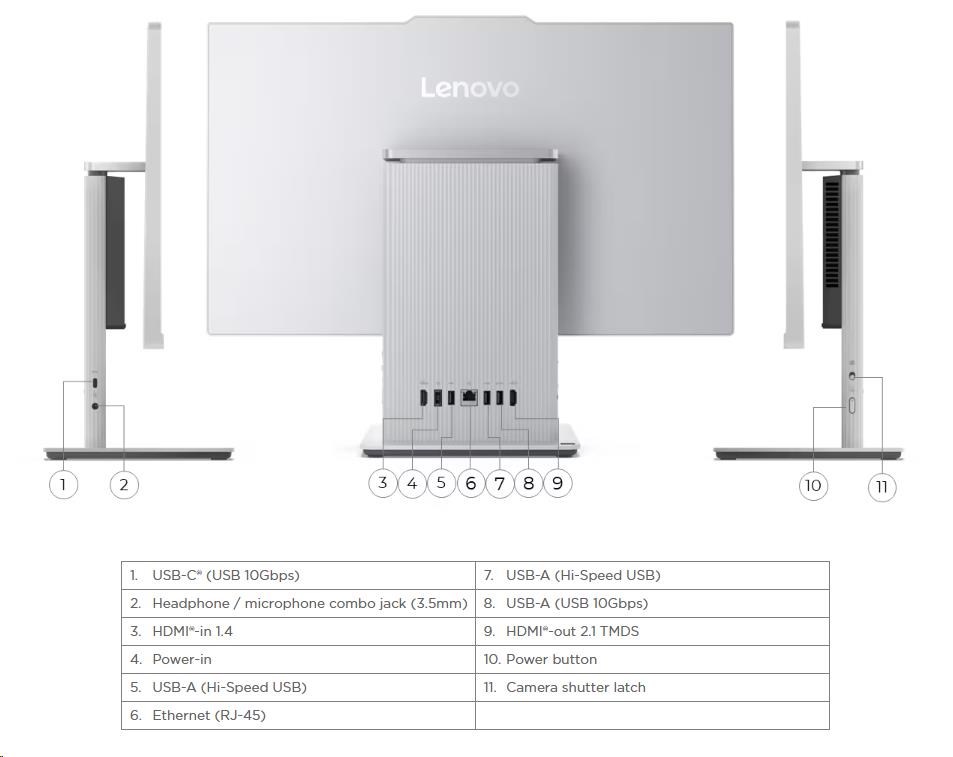 | Standartné porty | 1x USB-A (USB 10Gbps / USB 3.2 Gen 2) 2x USB-A (Hi-Speed USB / USB 2.0) 1x HDMI®-in 1.4 1x HDMI®-out 2.1 TMDS 1x Ethernet (RJ-45) 1x power connector 1x USB-C® (USB 10Gbps / USB 3.2 Gen 2), data transfer only 1x headphone / microphone combo jack (3.5mm) |