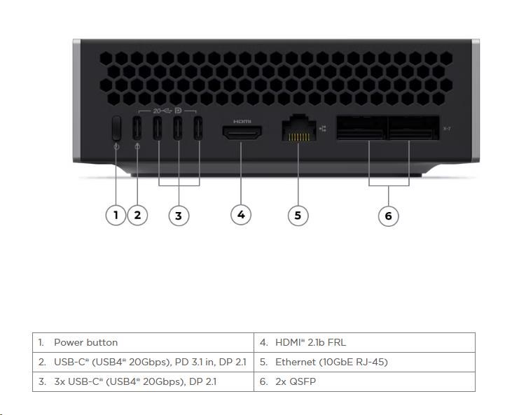 | Zadné porty | 1x USB-C® (USB 20Gbps / USB4®), with USB PD 3.1 in and DisplayPort™ 2.1 2x QSFP (200Gbps each, for connecting two ThinkStation® PGX units) 3x USB-C® (USB4® 20Gbps), with DisplayPort™ 2.1 1x HDMI® 1x Ethernet (10GbE RJ-45) |