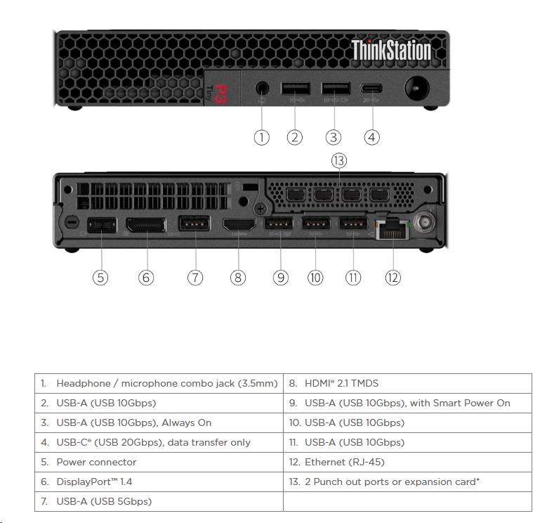| Predné porty | 1x USB-C® (USB 20Gbps / USB 3.2 Gen 2x2), data transfer only 1x USB-A (USB 10Gbps / USB 3.2 Gen 2), Always On 1x USB-A (USB 10Gbps / USB 3.2 Gen 2) 1x headphone / microphone combo jack (3.5mm) |