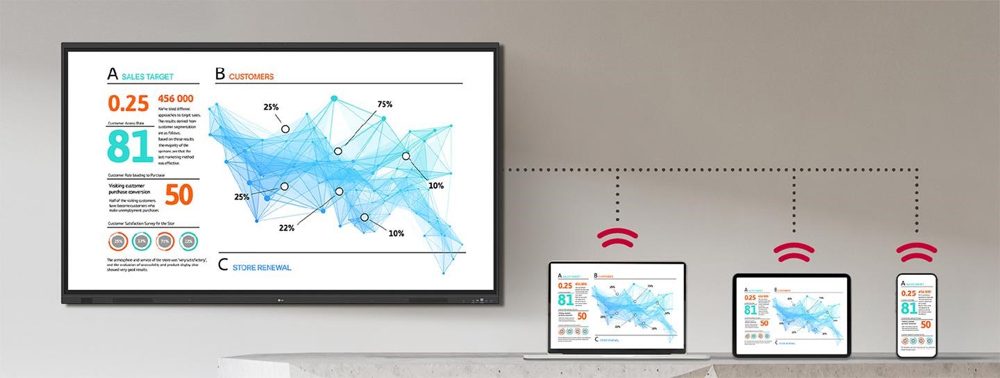 LG CreateBoard Share ponúka funkciu bezdrôtového zdieľania obrazovky, ktorá používateľom poskytuje flexibilné prostredie pre diskusiu. Svoj obraz môžu zdieľať zo svojho PC, tabletu alebo smartfónu, čo výrazne zjednodušuje proces zdieľania a spolupráce na tímových projektoch či prezentáciách.