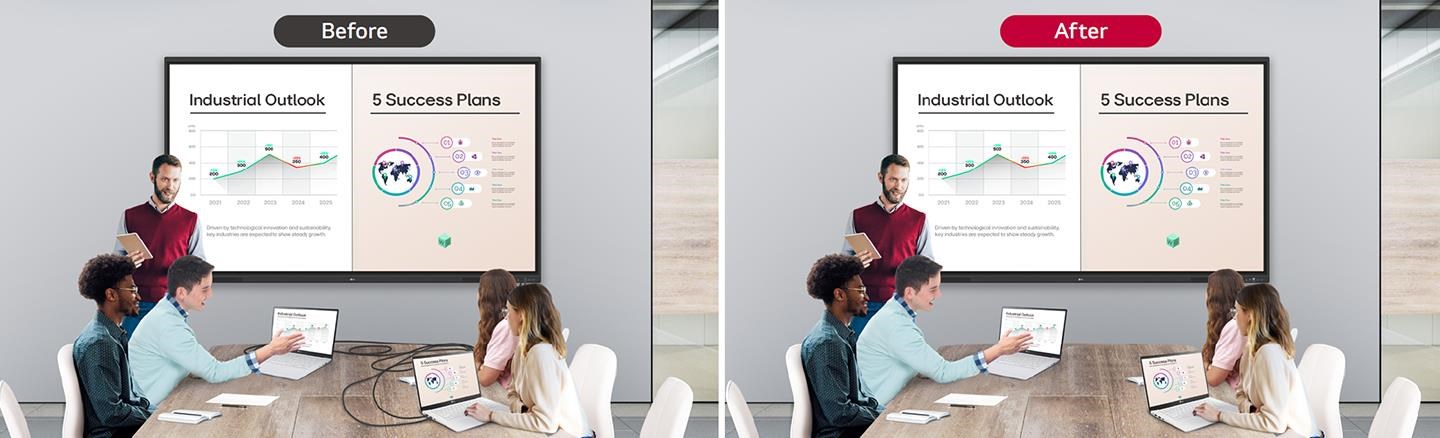 LG CreateBoard Share umožňuje plynulé a stabilné prostredie pre stretnutia vďaka technológii bezdrôtového zdieľania obrazovky – bez potreby ďalších káblov či pripojení. Prezentujúci môžu voľne zdieľať svoje obrazovky bez neustáleho odpojenia a pripájania káblov. Vďaka možnosti zdieľať až 9 obrazoviek súčasne je možné zobraziť materiály od viacerých účastníkov naraz, čo zvyšuje efektivitu spolupráce a tímovej produktivity.