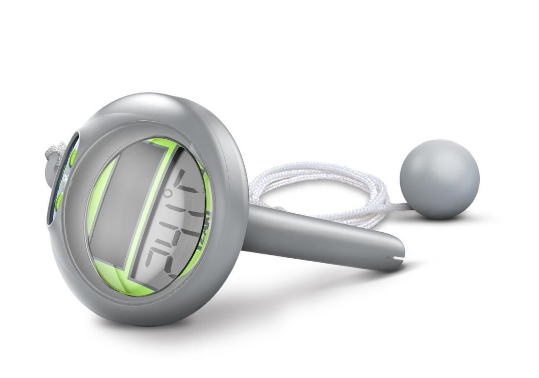 Digitálny ponorný solárny teplomer určený na meranie teploty vody v bazéne.