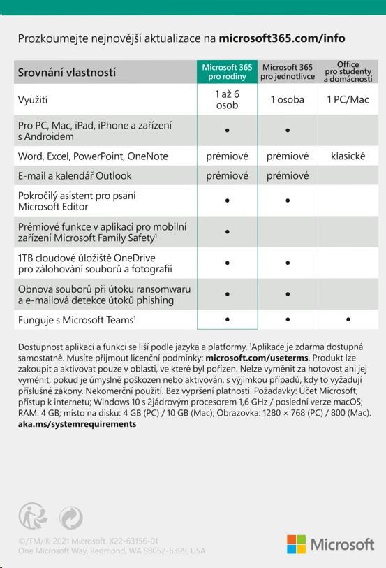 Pre koho je licencia určená:Pre domácnosti; Jazyk:Český; Spôsob platby:Prenájom; Perióda platby:1 rok; Produktový rad:Office 365
