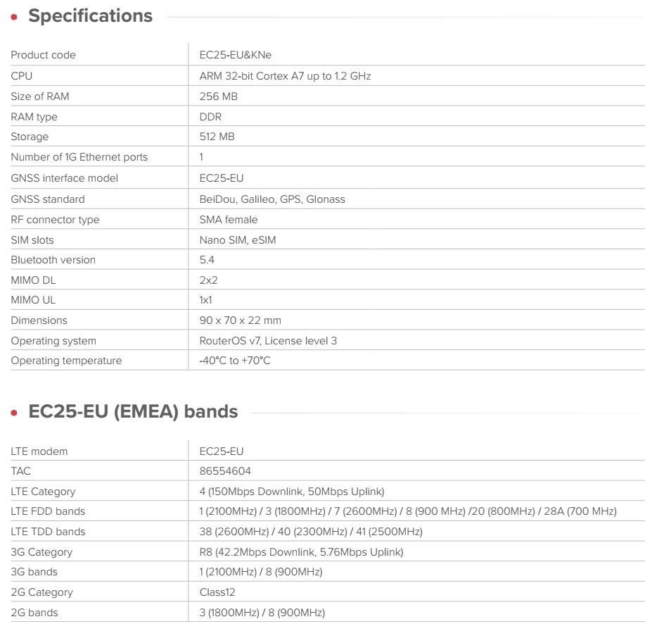 Brána IoT průmyslové třídy s LTE/BLE/GNSS konektivitou pro inteligentní sledování majetku, vzdálené monitorování a efektivní automatizaci. Původně navrženo pro kávovary a prodejní automaty – ideální pro všechny druhy průmyslové automatizace. KNOT Embedded LTE4 je malá, ale výkonná průmyslová LTE brána určená pro integrátory, specialisty na automatizaci a tvůrce systémů IoT. Hodí se do stísněných prostor, montuje se přímo na DIN lištu a poskytuje spolehlivé připojení LTE Cat4 s podporou Bluetooth a GNSS. Použijte ji jako primární bránu, záložní spojení nebo uzel pro sběr dat IoT – vše je poháněno systémem RouterOS pro maximální flexibilitu. Funkce a vlastnosti KNOT Embedded LTE4 je určen pro prostředí, kde je omezený prostor, ale spolehlivost je zásadní: • Infrastruktura inteligentních měst (parkování, senzory, měření) • Monitorování kávovarů a prodejních automatů • Skříně pro průmyslovou automatizaci • Monitorování životního prostředí a veřejných služeb • Sledování vozidel nebo majetku pomocí GNSS • Prodejní kiosky, platební terminály, digitální značení • Záložní připojení LTE pro stávající zařízení Ethernet • Brány IoT pro senzory a majáky BLE Upozornění: IoT brána není plnohodnotným LTE routerem. SIM karta není určená pro vytáčení připojení, ale pro komunikaci v síti IoT. IoT brána nedisponuje LTE modemem. Technické specifikace: Product code: EC25-EU&KNe CPU: ARM 32-bit Cortex A7 up to 1.2 GHz Size of RAM: 256 MB RAM type: DDR Storage: 512 MB Number of 1G Ethernet ports: 1 GNSS interface model: EC25-EU GNSS standard: BeiDou, Galileo, GPS, Glonass RF connector type: SMA female SIM slots: Nano SIM, eSIM Bluetooth version: 5.4 MIMO DL: 2x2 MIMO UL: 1x1 Dimensions: 90 x 70 x 22 mm Operating system: RouterOS v7, License level 3 Operating temperature: -40°C to +70°C Napájení: Number of DC inputs: 2 (PoE-In, USB Type-C (powering only)) PoE-In input Voltage: 12-57 V USB Type-C input voltage: 5 V Power adapter nominal voltage: 5 V Power adapter nominal current: 0.8 A PoE-in: 802.3af/at Max power consumption: 7 W EC25-EU (EMEA) podporovaná pásma: LTE modem: EC25-EU TAC: 86554604 LTE Category: 4 (150Mbps Downlink, 50Mbps Uplink) LTE FDD bands: 1 (2100MHz) / 3 (1800MHz) / 7 (2600MHz) / 8 (900 MHz) /20 (800MHz) / 28A (700 MHz) LTE TDD bands: 38 (2600MHz) / 40 (2300MHz) / 41 (2500MHz) 3G Category: R8 (42.2Mbps Downlink, 5.76Mbps Uplink) 3G bands: 1 (2100MHz) / 8 (900MHz) 2G Category: Class12 2G bands: 3 (1800MHz) / 8 (900MHz) Internet věcí (anglicky Internet of Things, zkratka IoT) je termínem pro moderní přístroje ovladatelné i na dálku pomocí internetu. Snadno je tak obsloužíte pomocí svého chytrého telefonu nebo je jednoduše připojíte k centrální jednotce. Umožní tak snadno zautomatizovat věci, o které byste se jinak museli postarat sami. Jedná se o technologický koncept umožňující realizaci takzvaného "inteligentního domu" (automatické zhasínání světel, ovládání vytápění apod.). Umožňuje řídit klimatizaci, vyhřívání vašeho bazénu, ohřev vody, pečovat o vaše akvárium, obsluhovat nastavení alarmu či mechanických zámků. Pokud si nejste jistí, zda jste v ranním shonu vypnuli žehličku, můžete na dálku odpojit od sítě jednotlivé zásuvky. Vaše lednička vás dokáže upozornit na chybějící potraviny a připravovat aktualizovaný nákupní seznam. Upozornění Výrobce Mikrotik neposkytuje záruku na zařízení poškozená přepětím. Zařízení je třeba adekvátně chránit proti indukovanému elektrostatickému přepětí či přepěťovým špičkám na silovém vedení. Pro venkovní instalace používat výhradně stíněnou kabeláž (FTP/SFTP), jednotky korektně uzemnit (užití integrovaného zemnícího členu, ethernetové přepěťové ochrany). Zařízení vždy provozujte s poslední výrobcem publikovanou verzí (výrobcem označenou "Stable") operačního systému RouterOS. Taková verze garantuje nejoptimálnější funčknost, obsahuje opravené chyby z verzí předchozích a výkonová i funční vylepšení.Taková verze garantuje nejoptimálnější funčknost, obsahuje opravené chyby z verzí předchozích a výkonová vylepšení.