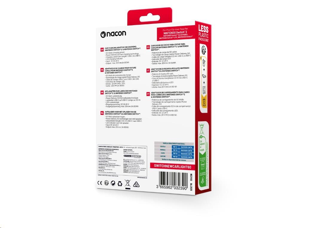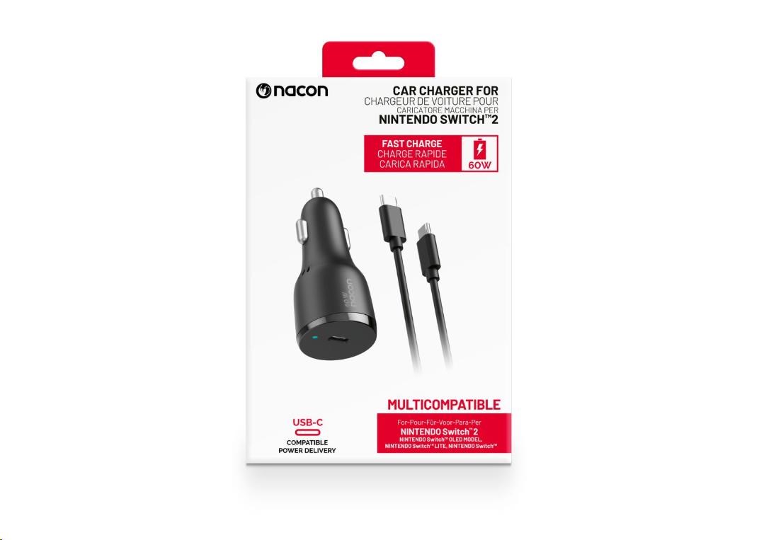 S týmto nabíjacím adaptérom od spoločnosti Nacon môžete pri ceste autom ľahko nabiť nielen novú hernú konzolu Nintendo Switch 2, ale aj konzolu Nintendo Switch, Switch Lite alebo Switch – OLED Model. Adaptér ľahko zapojíte do zásuvky zapaľovača v automobile a s pomocou USB-C kábla dlhého 1,5 metra ho následne prepojíte s konzolou, pričom o aktuálnom stave jej nabíjania vás bude informovať príslušný LED ukazovateľ. A pretože adaptér ponúka nabíjací výkon až 60 wattov a podporuje technológiu rýchleho nabíjania Power Delivery 3.0, bude vaša konzola znovu plne nabitá skôr, než sa nadívate.