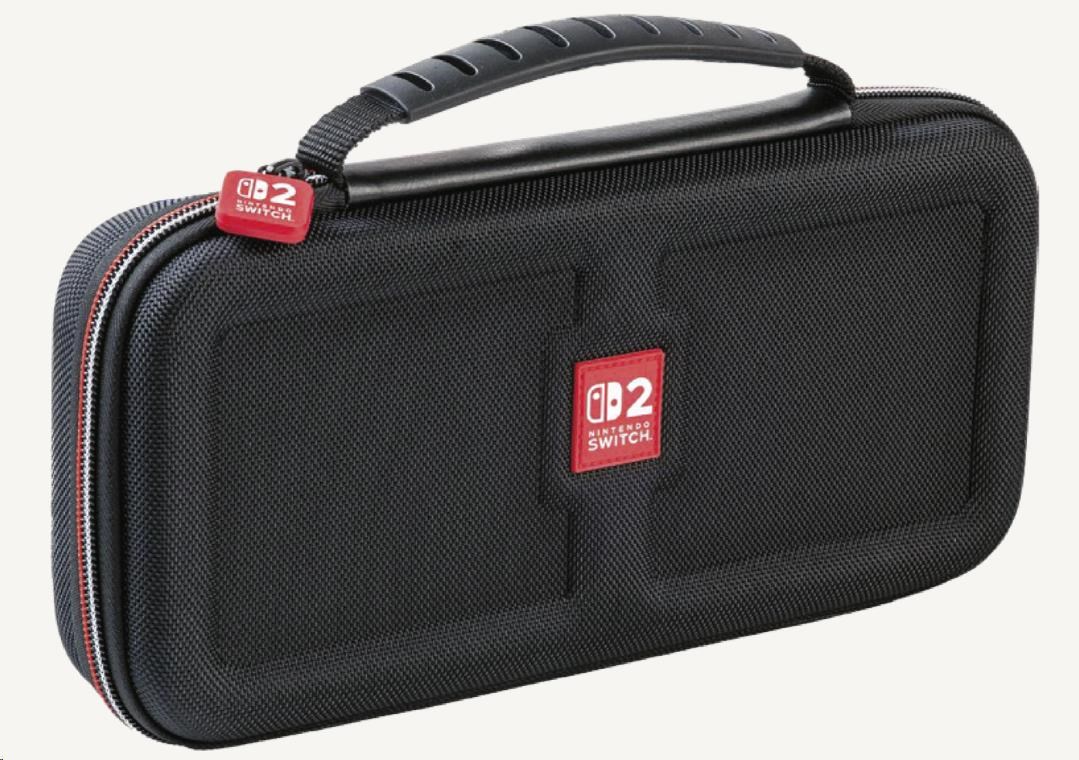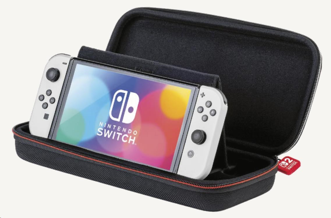 V tomto luxusnom prepravnom puzdre od spoločnosti Nacon môžete bezpečne a pohodlne prenášať nielen novú hernú konzolu Nintendo Switch 2, ale aj hernú konzolu Nintendo Switch alebo Switch – OLED Model. Ústredným prvkom tohto puzdra je nastaviteľný stojan, ktorý pri hraní umožňuje pohodlnejšie sledovať dianie na obrazovke, zatiaľ čo pri preprave chráni obrazovku aj analogové páčky konzoly pred poškodením. Na jeho vnútornom povrchu sa navyše nachádza dvanásť vreciek na uloženie kariet s vašimi obľúbenými hrami. Súčasťou balenia sú tiež dve menšie plastové puzdrá na microSD karty.