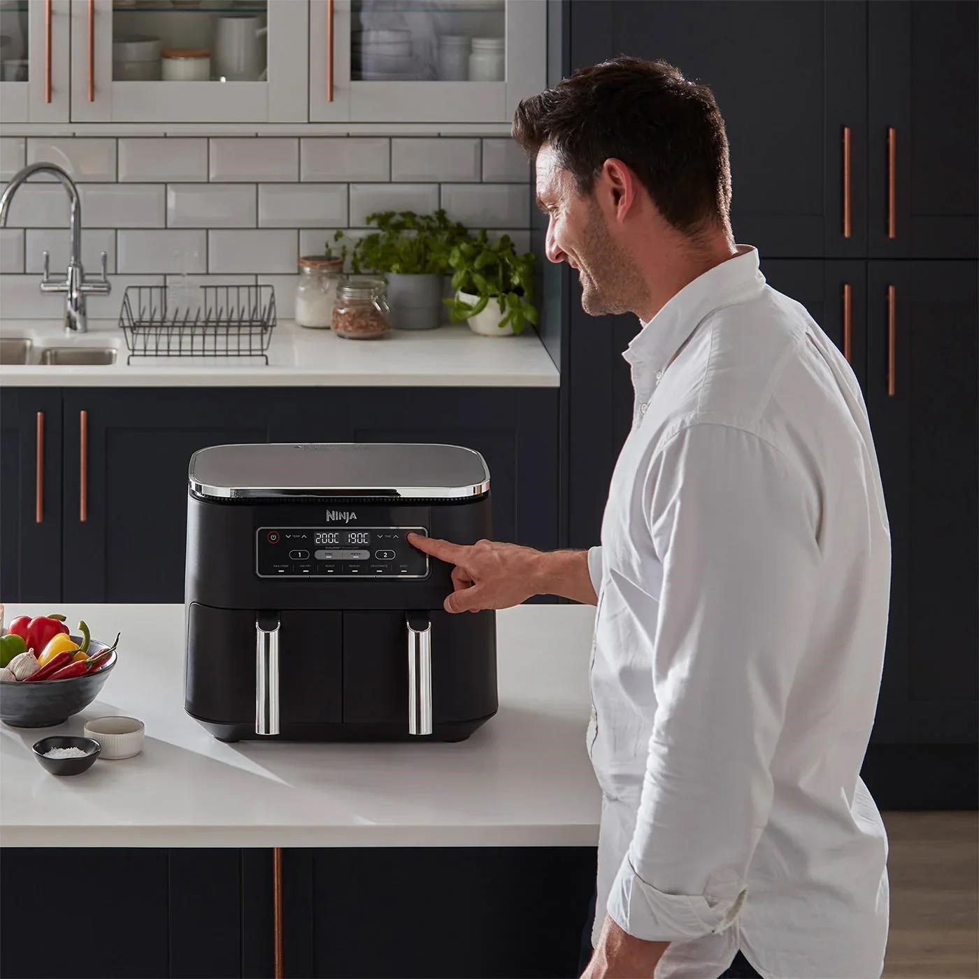 Horkovzdušná fritéza Ninja® Foodi® Dual Zone Air Fryer je první horkovzdušná fritéza se dvěma nezávislými koši o objemu 3,8 litru, ve které můžete vařit dvě jídla současně se dvěma způsoby, místo toho, abyste je vařili jedno po druhém, jako v tradičních horkovzdušných fritézách s jedním košem. 6 přizpůsobitelných programů: Max Crisp, Air Fry, Roast, Bake, Reheat a Dehydratace.