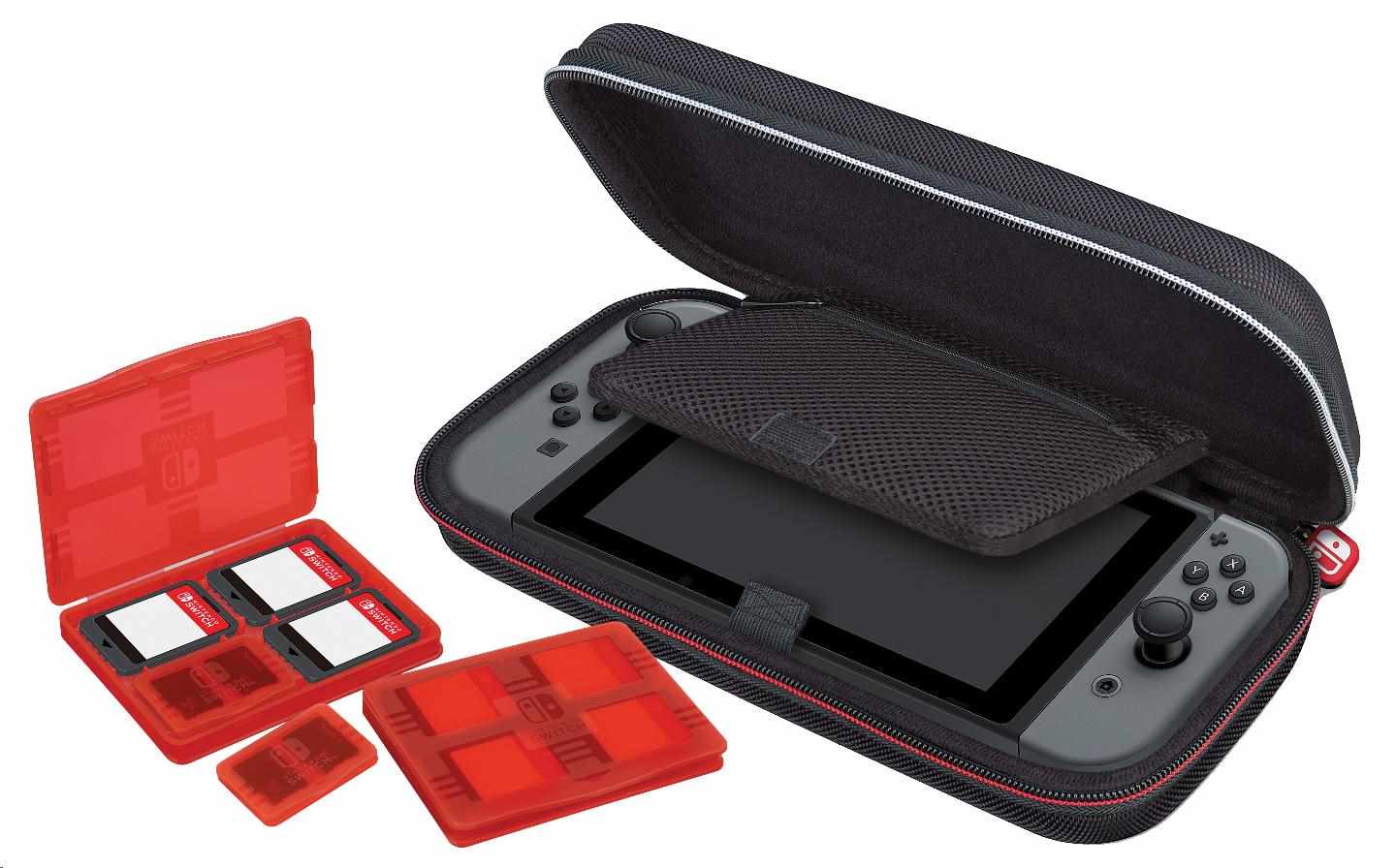 V tomto luxusnom cestovnom kufríku môžete bezpečne a bez starostí prepravovať svoju obľúbenú hernú konzolu Nintendo Switch™. Polstrovaná prepážka v strede puzdra chráni obrazovku konzoly pred poškriabaním a sieťované vrecko na zips na druhej strane môže ukladať karty s inými hrami.