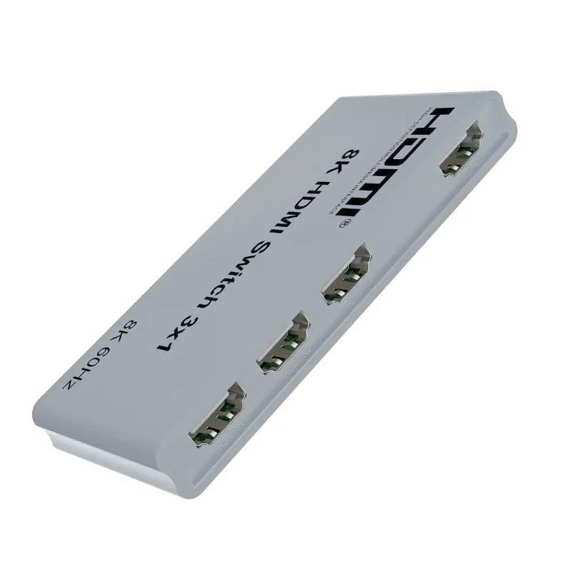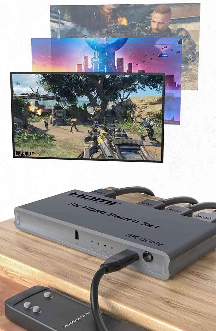 3 HDMI zariadenia na vstupe zdieľajú 1 výstupný monitor, projektor. Výber vstupných zariadení: 1.automaticky, 2.stlačením tlačidla na čele prepínača, 3.diaľkovým ovládačom