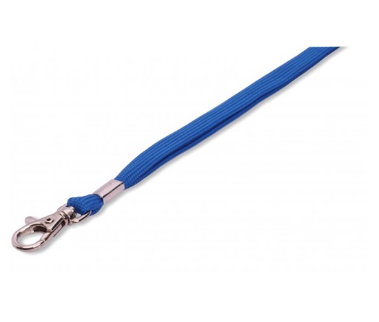 Dutá šnúra s modrou karabínou. Šírka šnúrky 12 mm, dĺžka 90 cm..