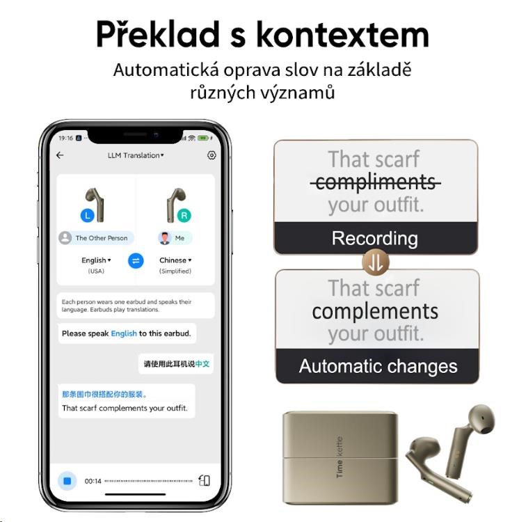 Prekonajte jazykové bariéry v reálnom čase s AI tlmočníkom a prekladateľom Timekettle W4. Podporuje obojstranný preklad vo 42 jazykoch a 95 dialektoch, takže konverzácie medzi rôznymi kultúrami sú plynulé a prirodzené. Či už cestujete, pracujete alebo spoznávate nových ľudí, W4 zabezpečí, že každé slovo bude správne pochopené. Rozlúčte sa s trapnými prestávkami a jazykovými nedorozumeniami – stačí rozprávať a AI sa postará o zvyšok. Komunikujte slobodne a sebavedomo kdekoľvek na svete bez jazykových obmedzení. Presnosť prekladu je až 98 % a AI slovník na princípe veľkých jazykových modelov (LLM) zabezpečí vďaka dokonalému porozumeniu presnú korekciu podobne znejúcich slov a celkové pochopenie kontextu konverzácie. aplikácia Timekettle vám navyše z konverzácií vytvorí prepis a AI zhrnutie.