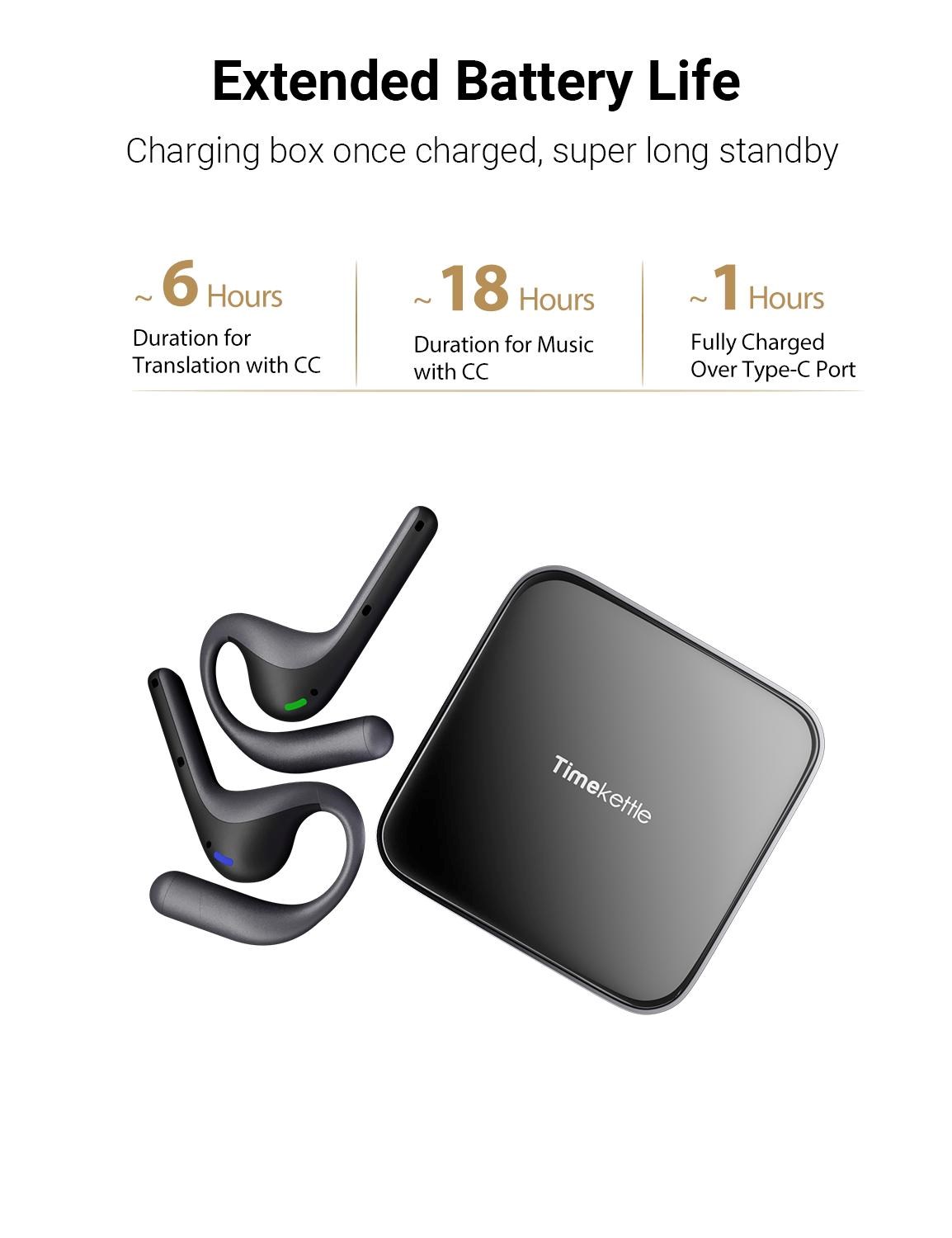 Praktické nabíjacie puzdro zabezpečuje, že budete mať slúchadlá vždy pripravené na použitie. Na jedno nabitie vydržia až 6 hodín nepretržitého tlmočenia, takže zvládnete aj dlhé rokovania bez prerušenia. Na počúvanie hudby ponúka až 12 hodín prehrávania.
