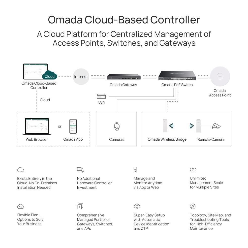 Cloudový kontrolér Omada, úplne dostupný v cloude pre platformu softvérovo definovaných sietí Omada (SDN), poskytuje 100% centralizovanú správu v cloude pre prístupové body, prepínače a brány – všetko z jedného rozhrania. Nie je potrebné investovať do dodatočného hardvéru alebo vykonávať inštaláciu na mieste u zákazníka. Použitie riešenia Omada typu Zero-Touch umožňuje vzdialené nasadenie a konfiguráciu sietí na viacerých lokalitách, takže nie je nutné posielať technika, aby vykonal konfiguráciu na mieste. Cloud Omada zabezpečuje efektívne nasadenie s nižšími nákladmi.