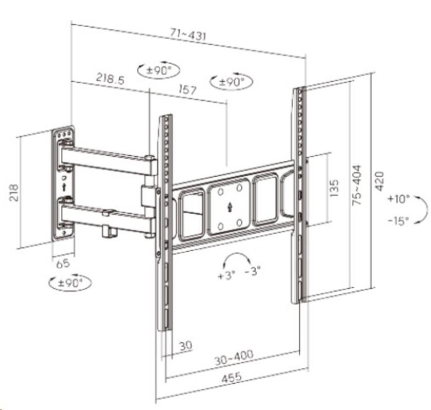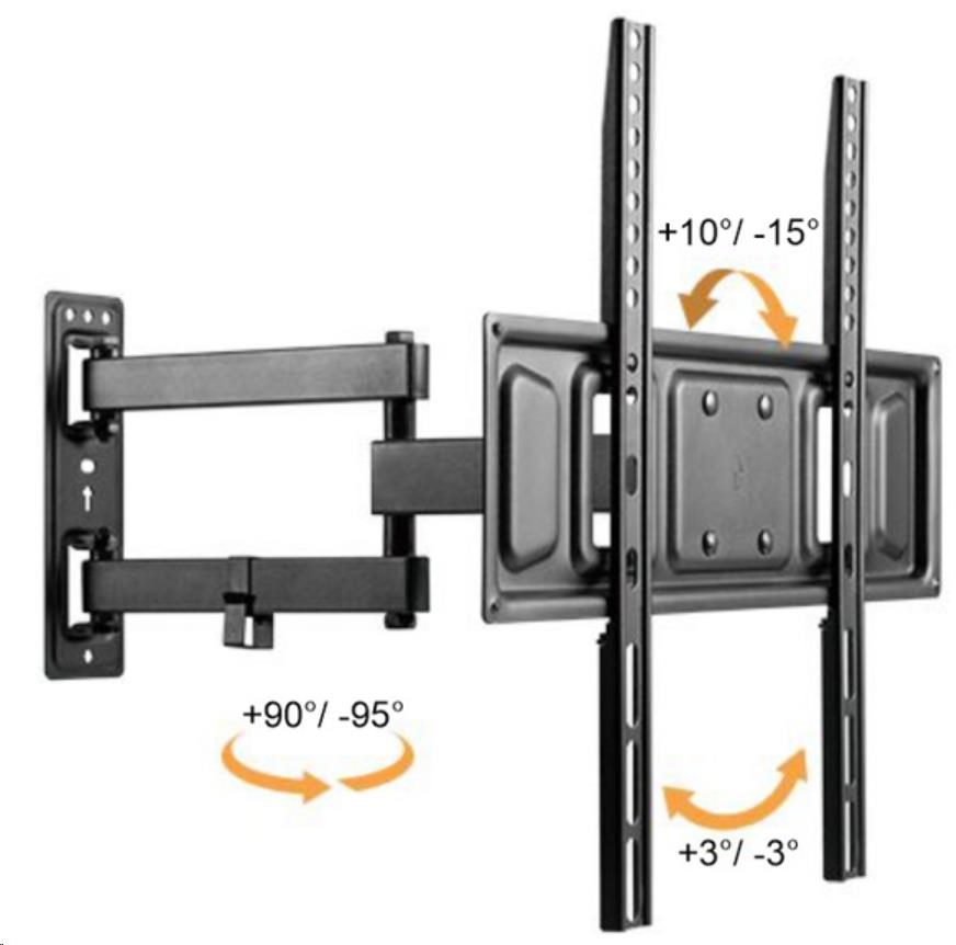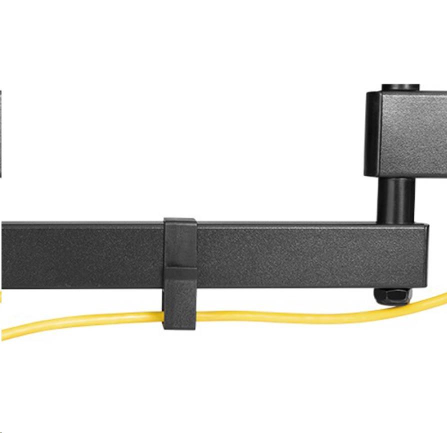 Výsuvný nástěnný držák LPA63-443 je určen pro instalaci TV s plochou obrazovkou s úhlopříčkami od 32“ do 55“. Jeho největší přednostní je robustní výsuvná konstrukce, díky níž unese TV o hmotnosti až 35 kg a zároveň umožňuje nastavit vzdálenost TV od stěny v rozsahu 71 mm až 431 mm, samozřejmostí je pak také velký rozsah polohování. Držák umožňuje snadné naklápění TV v rozsahu +10°~-15°, natočení do stran v rozsahu +90°~-90° a rotaci v rozsahu +3°~-3°, což maximalizuje flexibilitu sledování z libovolného místa v místnosti. Integrovaná svorka na kabely udržuje kabely uspořádané a chráněné.