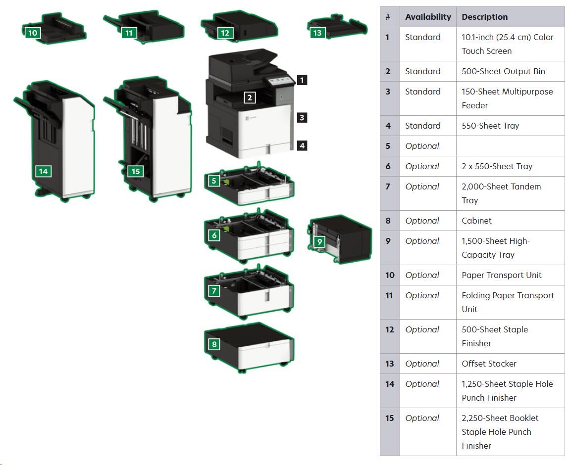 Tlačové technológie:Laserová; Maximálny formát tlače/média:A3; Skutočné rozlíšenie tlačiarne (v DPI):1200x1200; Rozhranie tlačiarne:Sieťové; Maximálna rýchlosť tlače (A4 za minútu):45; Automatická obojstranná tlač (Duplex); Štandardný počet vstupných zásobníkov:2; Maximálny počet vstupných zásobníkov:6; Typ skenera:Plochý