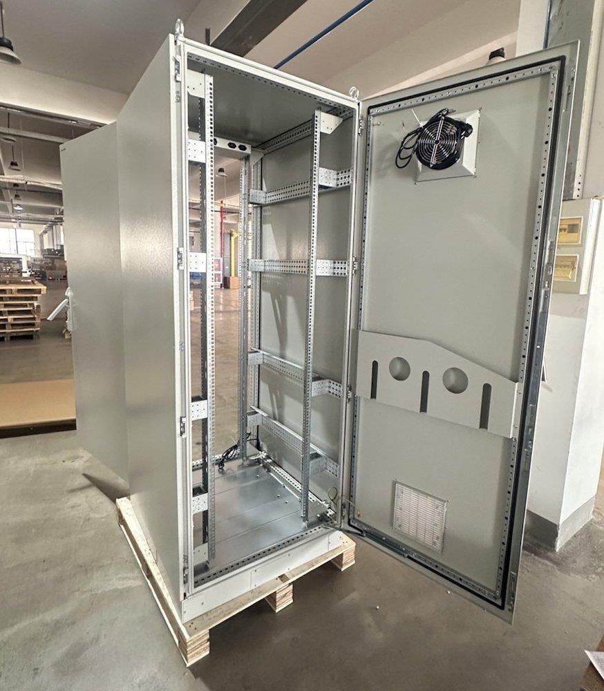 Rozvádzač pre inštaláciu dátových a telekomunikačných zariadení, ventilácia s termostatom, podstavec, sivý.